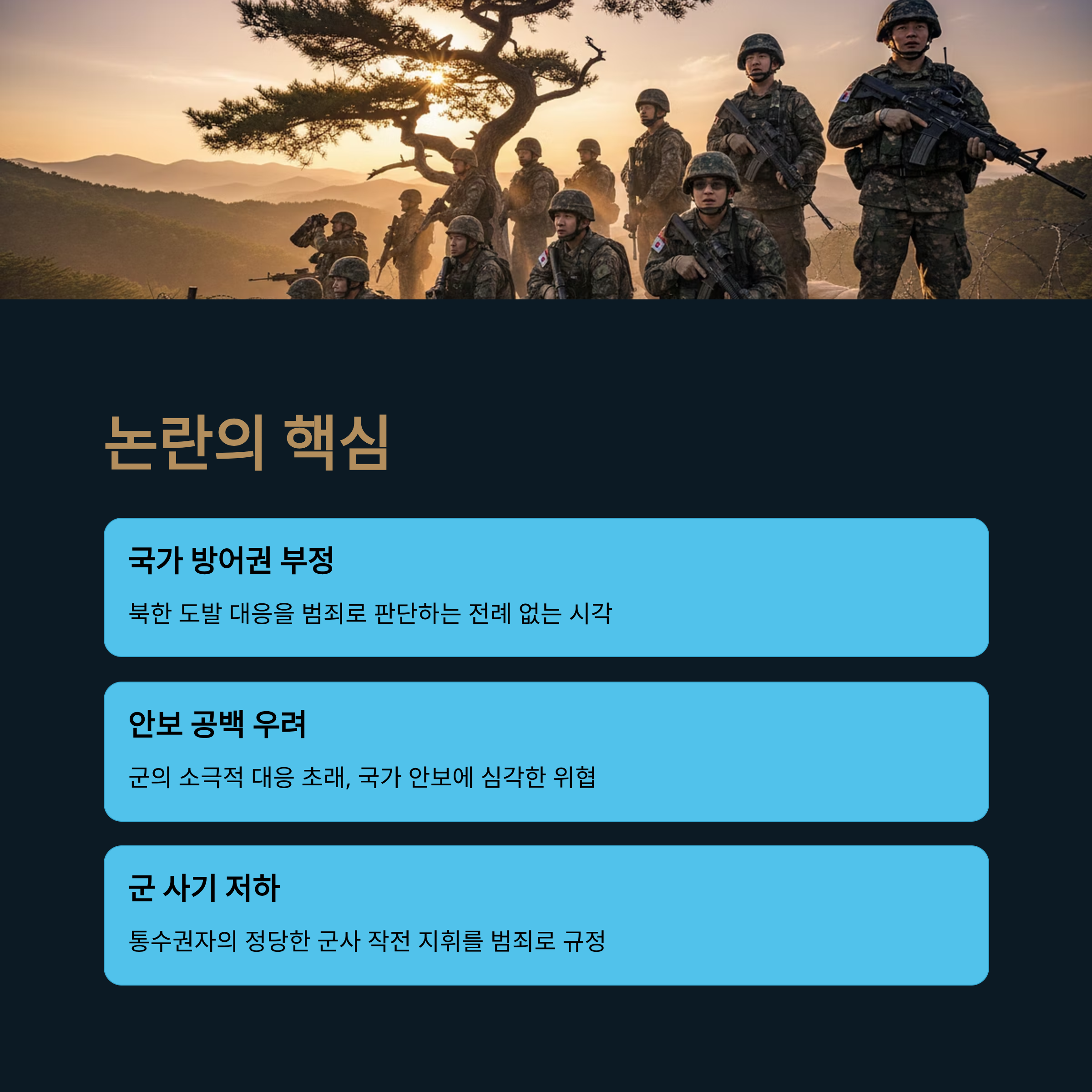 안보 공백 우려: 적의 도발에 대한 군사적 대응을 이적죄로 처벌할 경우, 향후 군의 대응 위축과 국가 안보에 심각한 위협이 될 수 있다는 지적이 나옵니다.
